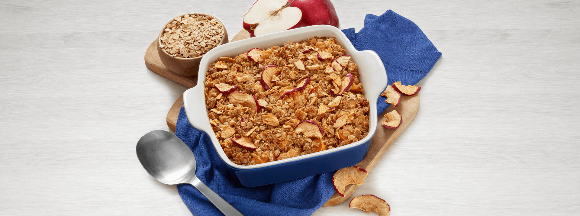 - Topping: Toss together oats, brown sugar and flour; using fingertips, cut in butter until crumbly. Toss in apple chips. Sprinkle evenly over fruit mixture.