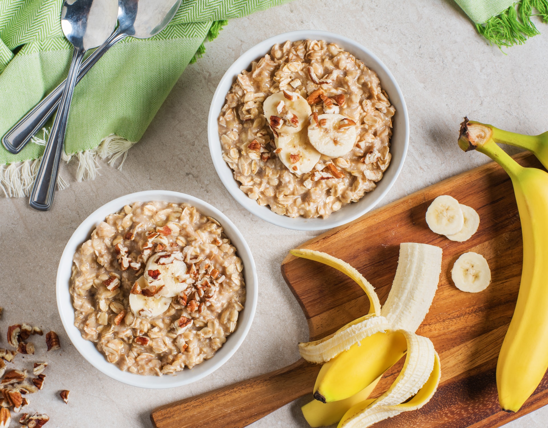 - Remove oatmeal from heat. Stir in mashed bananas and pecans. Spoon oatmeal into six cereal bowls. Top with yogurt, sliced bananas and pecan halves, if desired.